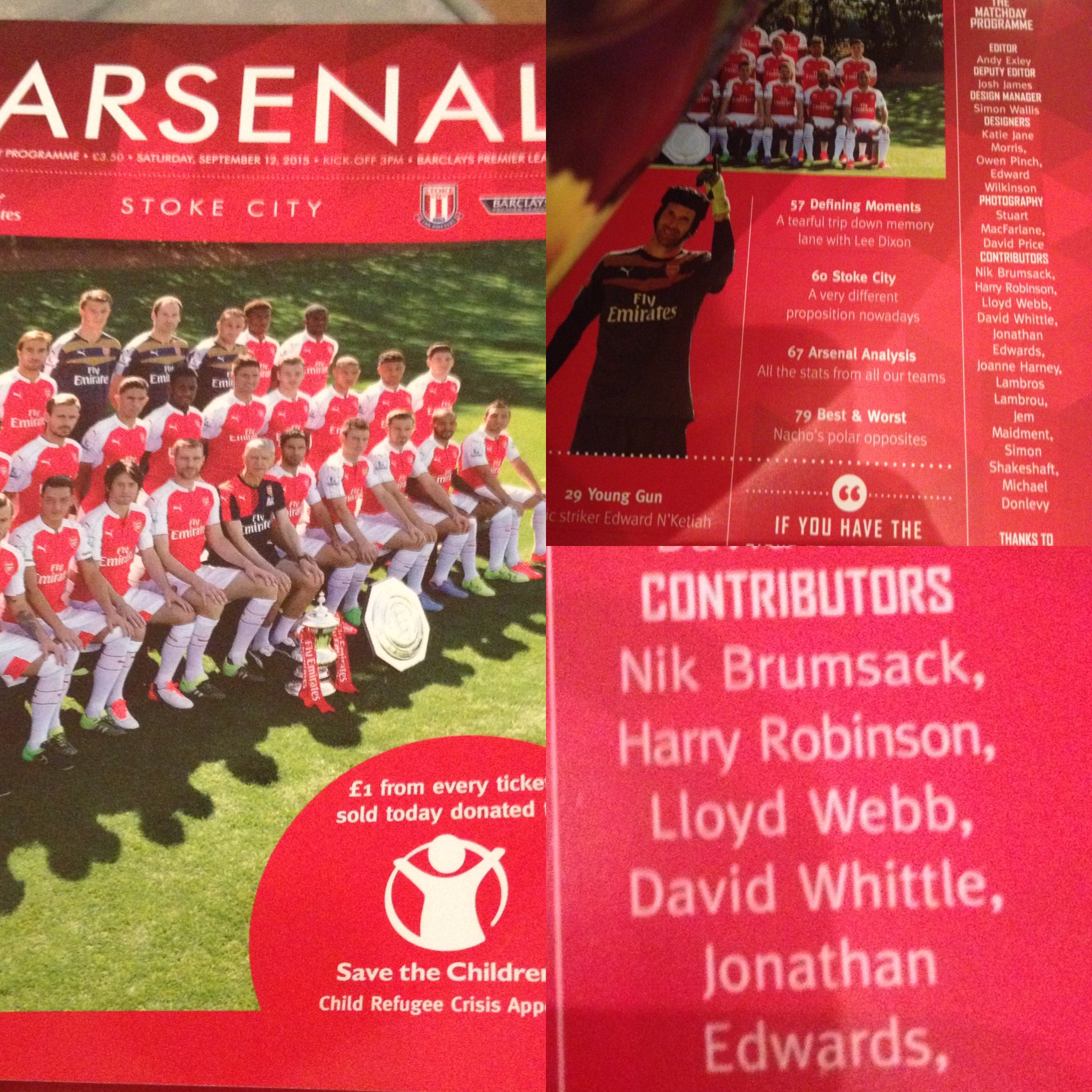 I thought I’d share a few proud moments for myself over the past few weeks. Firstly, I was given a line of credit in the Arsenal vs Stoke City programme at the Emirates on September 12th, there’s a picture below. I went to the Arsenal media office for a day in August where I helped prepare the programme. It was fascinating and only confirmed my desire to leave the relaxing life of a normal job and be a sports journalist.